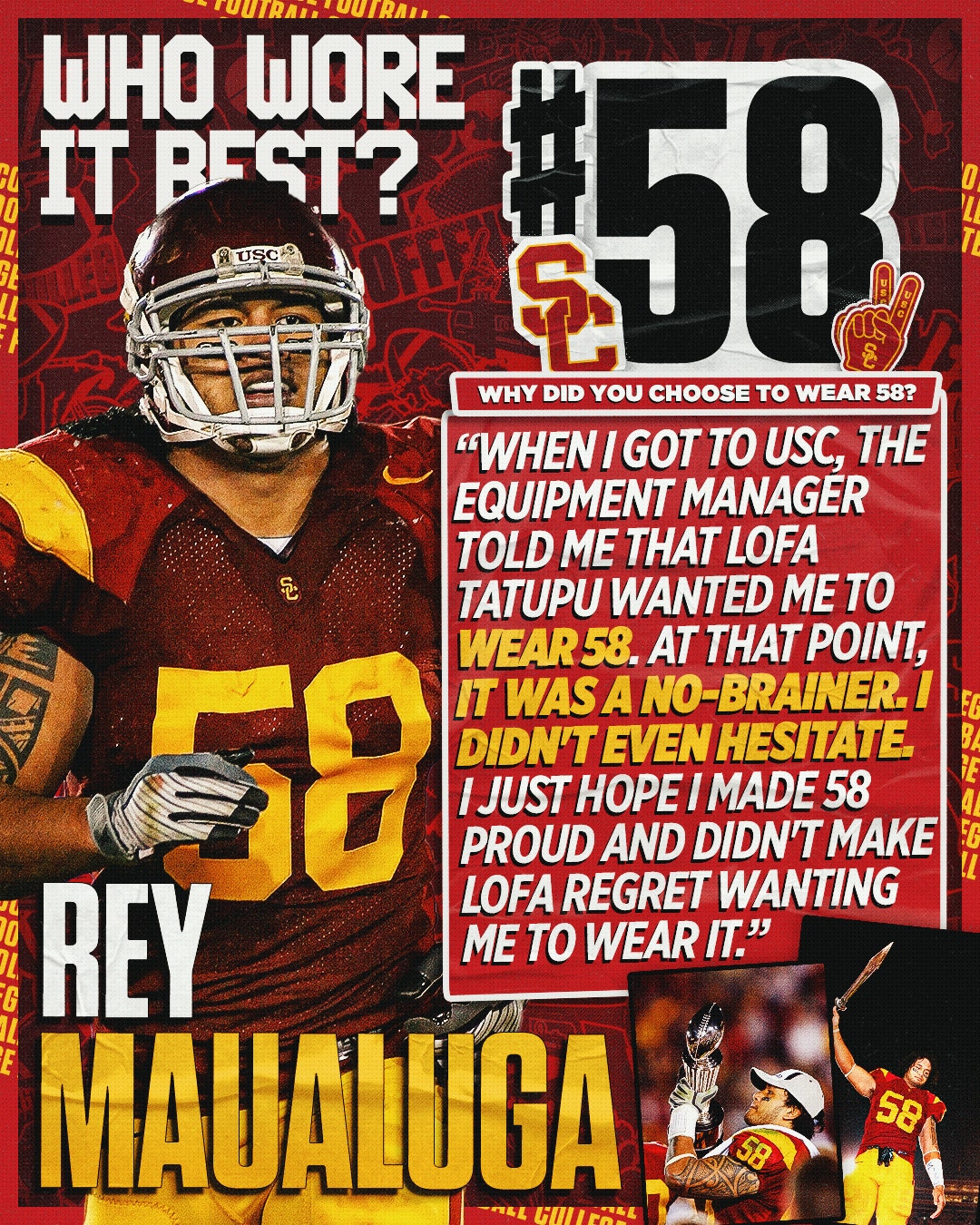 Maualuga was a standout linebacker at USC from 2005-08, known for his hard-hitting and downfield playing style. At 6-foot-3 and 250 pounds, the former Trojan was the ideal size for a middle linebacker and consistently used that size to his advantage. He finished his college career with 273 tackles, nine sacks and five interceptions. Maualuga was a three-time All-Pac-10 performer and a unanimous All-American in 2008.